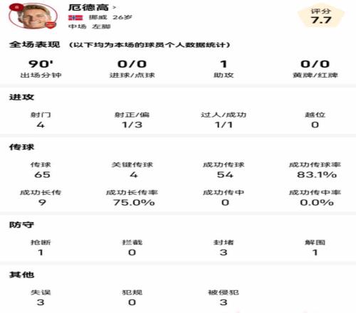 厄德高本场比赛贡献4次射门,1次成功过人;65次传球。4次关键传球,1次助攻,传球成功率83.1%。防守方面还贡献了1次抢断3次封堵和1次解围。