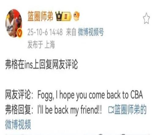 弗格是辽宁男篮三连冠的大功臣,他也在总决赛中获得过MVP奖项。不过由于年龄偏大的原因,弗格上个赛季的状态下滑比较明显,辽宁男篮并没有和他续约。就在日前,弗格在社交媒体上发布了自己的训练照片,引发了曾经的队友莫兰德、以及不少球迷的关注。有球迷留言表示,希望他能够重返CBA打球。弗格对此进行了回复,他表示很快就会回来。