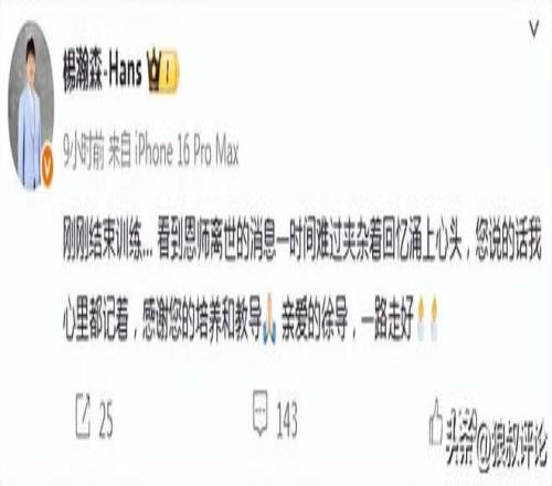 杨瀚森发文送别恩师:刚刚结束训练… 看到恩师离世的消息一时间难过夹杂着回忆涌上心头,您说的话我心里都记着,感谢您的培养和教导[祈祷] 亲爱的徐导,一路走好。