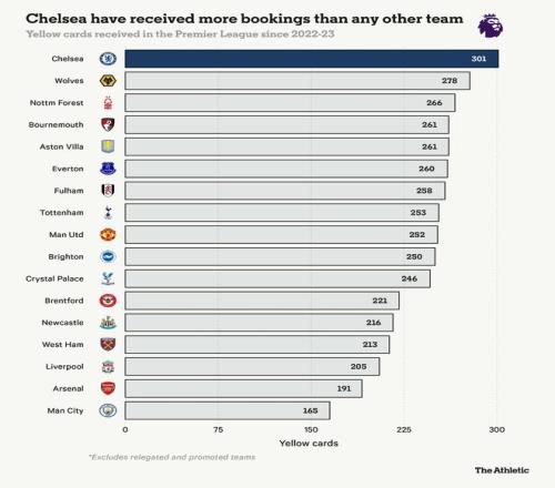 以下是每张黄牌的具体内容。更直观地讲,自2022-23赛季以来,切尔西在英超联赛中因异议/争吵和假摔而获得的黄牌数量最高。他们在拖延时间(仅次于阿斯顿维拉,39张)和鲁莽犯规(仅次于水晶宫,95张)方面也排名第二。