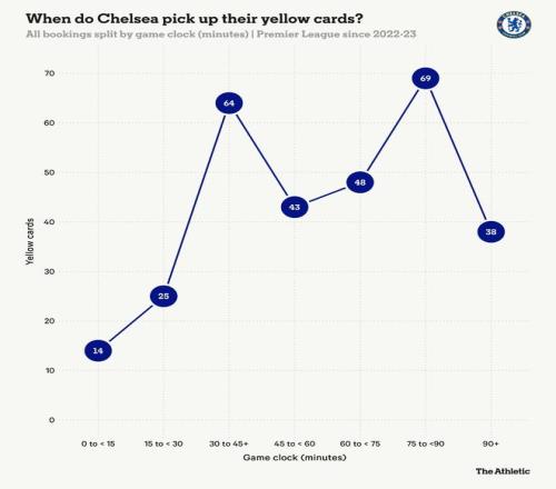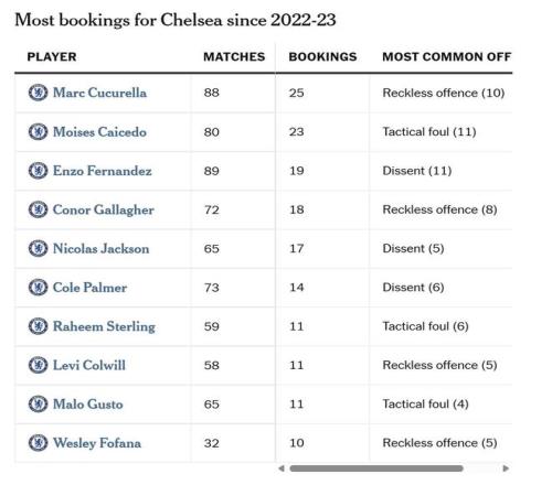 不可避免地,这些球员大多是防守型球员,但帕尔默、恩佐-费尔南德斯和雅克松在所有类别中因异议而吃到最多黄牌的事实,凸显了球队的一些不成熟。费尔南德斯在比赛日要么是队长,要么是副队长。他19张黄牌中有11张是因异议而吃到的,这很难说是一个好的榜样。