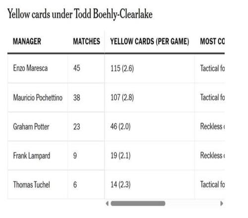 鉴于图赫尔、波特和兰帕德都在2022-23赛季执教过切尔西,因此很难评估该赛季的任何趋势,但你可以从波切蒂诺(2023-24 年)和马雷斯卡(2024 年至今)的任期中寻找某种模式,他们是英超联赛中场均黄牌最多的切尔西主教练。