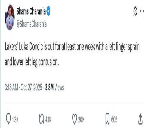 在对阵森林狼队爆砍49分11篮板8助攻率队取胜后,ESPN名记Shams曝出湖人后场核心东契奇遭遇左手指扭伤与左小腿挫伤,预计将缺席一周时间。