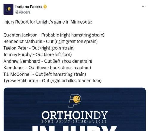 这样的状况也并非竞争激烈的西部特有,在对阵森林狼的比赛中,步行者队更是一口气7人缺阵,其中包括哈利伯顿、内姆哈德、马瑟林与麦康奈尔等诸多核心轮转球员。