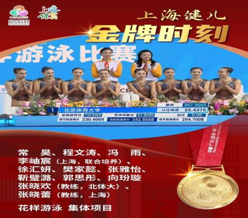 在刚刚结束的十五运会花样游泳集体项目比赛中,由上海与北京体育大学联合培养的运动员李岫宸携手队友常昊、程文涛、冯雨、徐汇妍、樊家懿、张雅怡、靳璧潞、郭思彤、向玢璇成功摘得桂冠!上海队收获第五名。